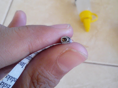 3. Setelah selesai, renggangkan kira-kira sampai diameter 1 cm, bisa pakai penggaris quilling yang bolong-bolong itu loh (maklum, disini aku pakai alat seadanya). Setelah itu, lipat mengerucut salah satu bagian atau sisi lingkaran, ribet ya? Lihat gambar di bawah ini deh ;)
